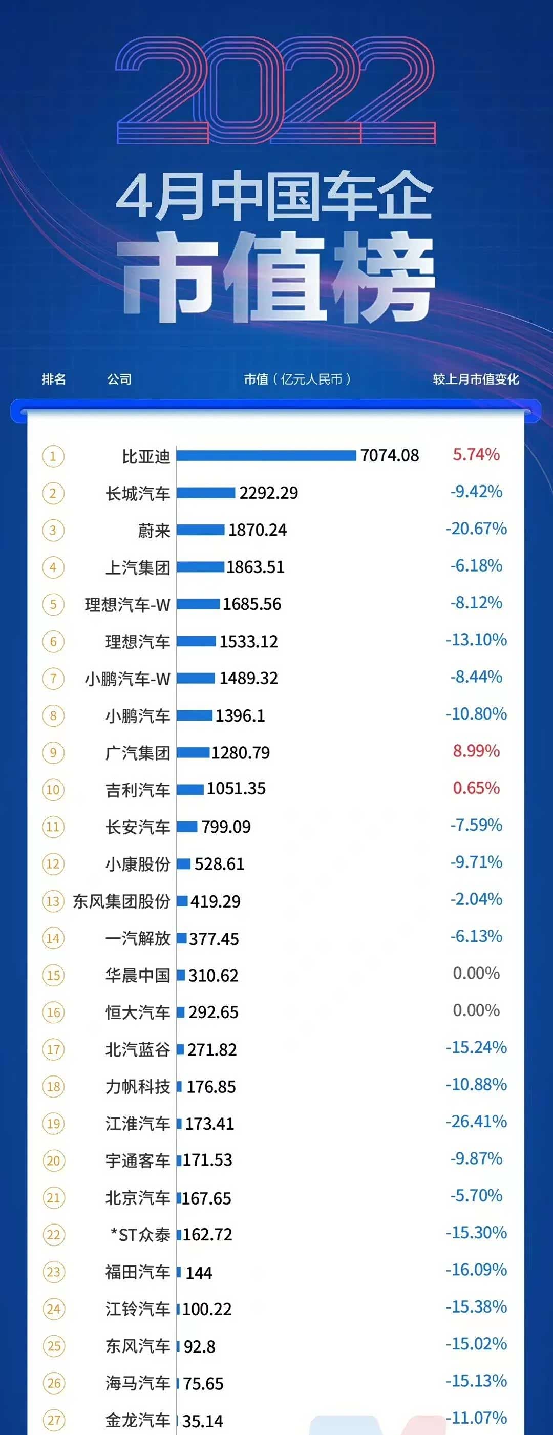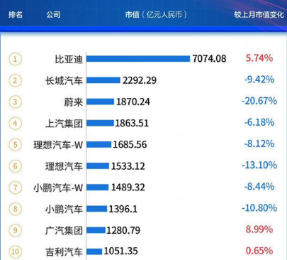 2022年四月中国车企市值(人民币)排行榜 截至2022年4月30日