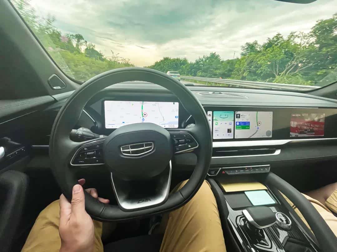 优点有:第一,智能驾驶水平很高,在G-pilot智能驾驶模式下,车身能很稳的保持在车道中,不会在车道中间左右画龙,并且在穿越隧道时,能识别限速标识并自动将车速降到80公里/小时。但遗憾的是它似乎只能识别减速标识,所以每次穿越隧道之后还得手动将速度提高。此外隔着二三十米插进来一台车它的识别还算精准,但我在高速路上道口碰到一个大货车隔着七八米插进来,这台车没什么反应。所以它依然只是半自动驾驶,还需要你至少睁着一只眼。不过它确实能有效降低长途驾驶的疲劳感。你想想当你极度疲劳时,在单手搭在方向盘上半眯着眼看车道(如下图,手搭在方向盘上,其它交给机器),和双手紧握方向盘紧盯着车道还要不时左右调整,这两种状态谁更耗神呢?