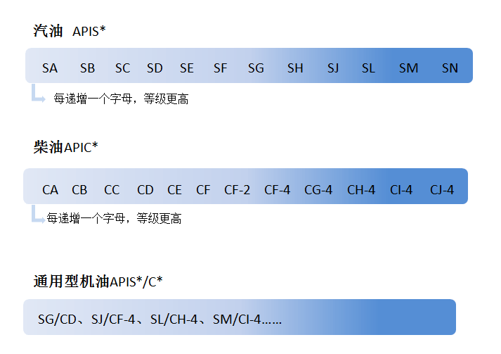 汽油机油用S系列表示,即 APIS*;柴油机油用C系列代表,如APIC*;汽柴通用油,即为APIS*/APIC*。其中*,表示机油的等级。
