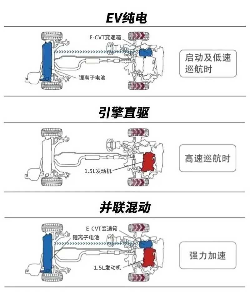关于DM-i混动的工作逻辑,基本上与本田i-MMD类似,都是中低速使用纯电驱动,高速巡航发动机是直驱状态,加速过程发动机和电动机同时并联输出。