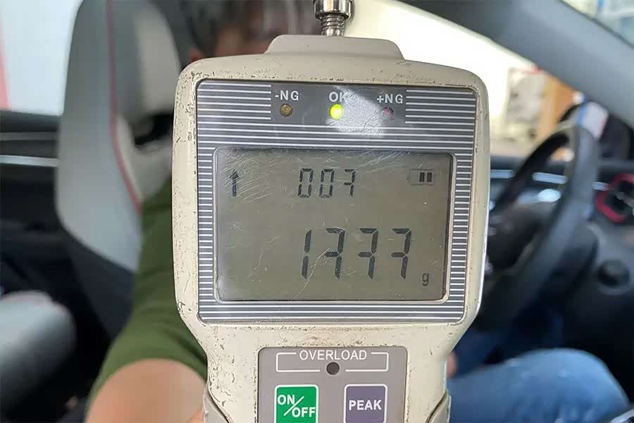 我们在同一路段(地面摩擦力相同),胎压调至厂家标准胎压,使用标准模式,用拉力计原地匀速旋转方向盘90度,取最大数值。