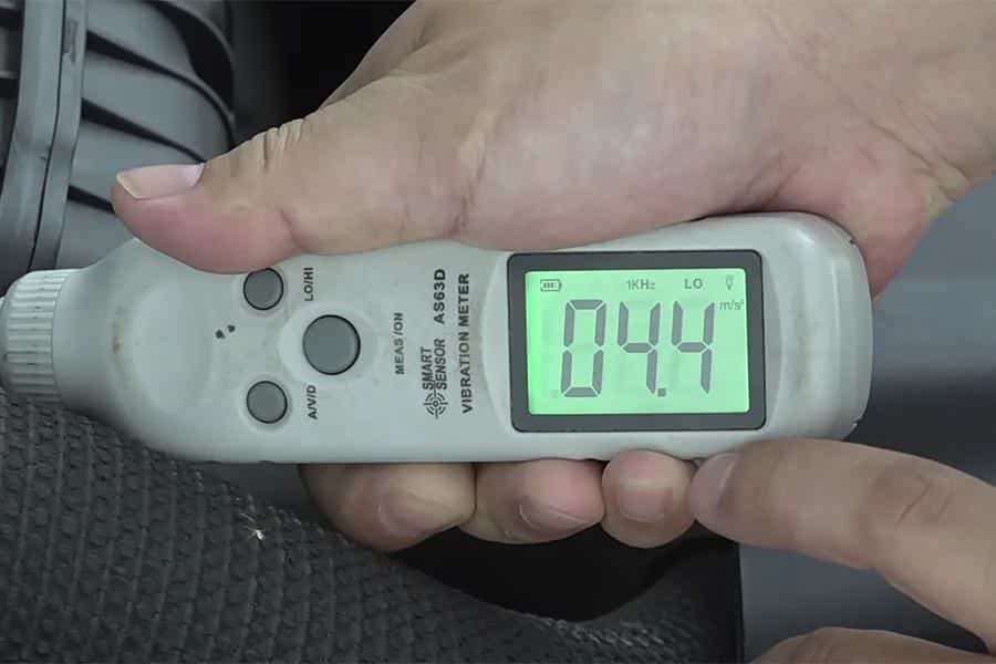 测试方法:水温正常后,关掉空调,在怠速状态下,使用测振仪垂直曲轴方向,将探针接触发动机金属机体中间的最高位置,测量发动机振动加速度值,数值越低,表明振动越小。