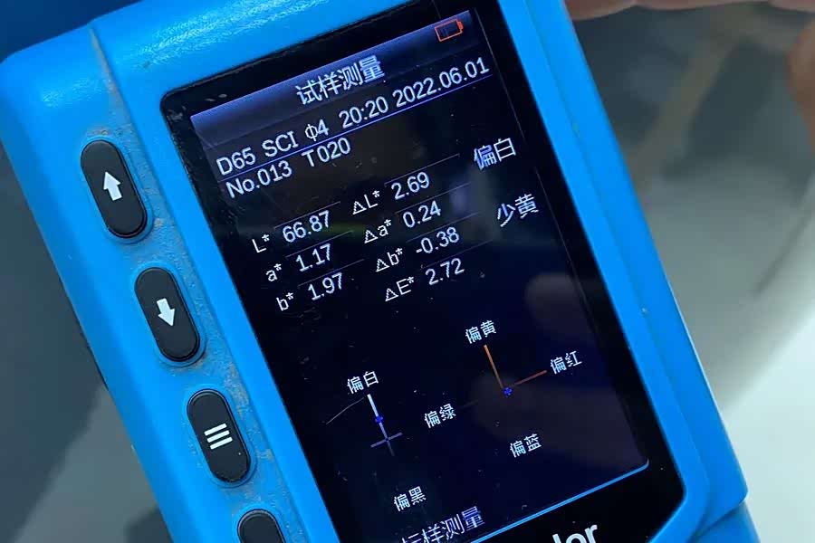 测试方法:使用色差计在引擎盖中央位置取基准数值。在车身其它位置进行对比测量,记录数值最大的位置。车身测试采样点不小于100个。