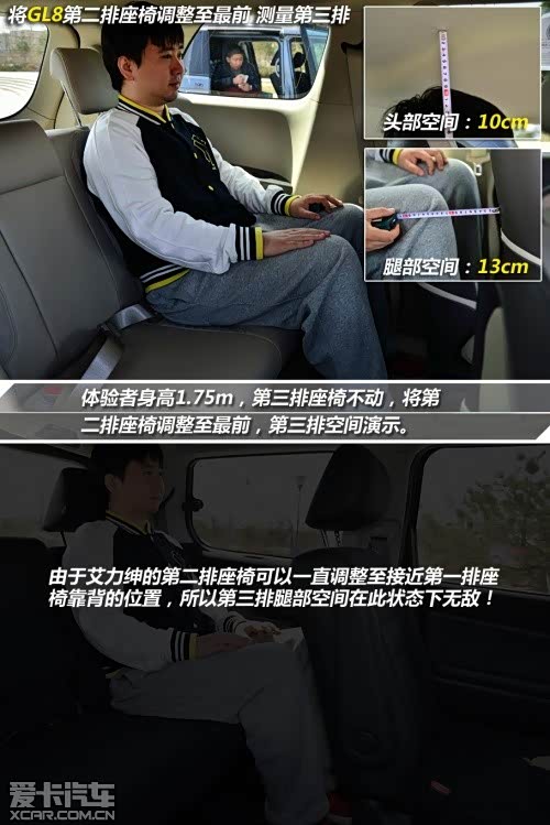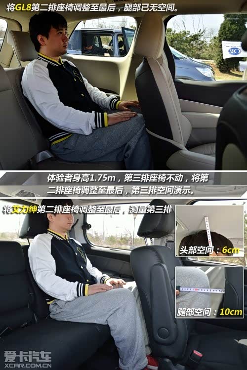 第三排空间同样是艾力绅更加舒适且灵活。由于艾力绅的第二排座椅能够一直向前调整至第一排座椅靠背处,所以此时第三排乘客可以获得无敌的腿部空间,而且艾力绅的第三排座椅所拥有的中央扶手也是GL8所不具备的。GL8在第二排座椅调整至最后的情况下第三排乘客已无腿部空间,而艾力绅则依然可以获得一拳的余量。但在头部空间上GL8要由于艾力绅。