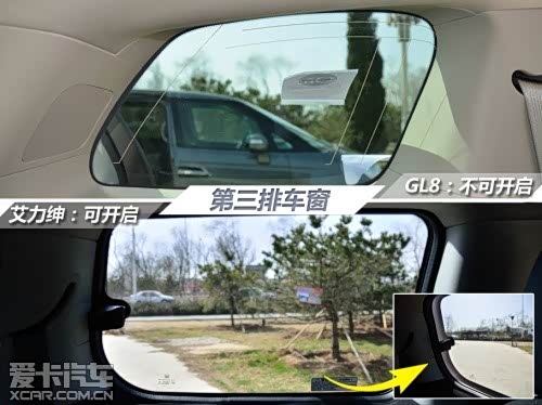 艾力绅的第三排车窗可以向外打开约6cm,而GL8则不能打开。可打开的车窗固然有很多好处,不仅对晕车的乘客有很大帮助,而且如果有吸烟的乘客坐在第三排,也能帮助烟雾快速散出。