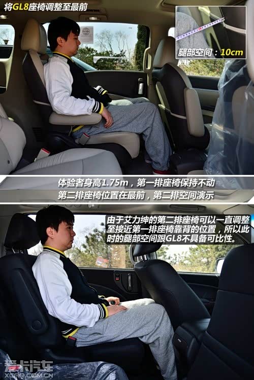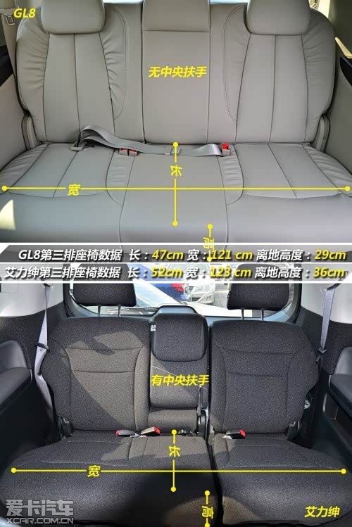 第二排空间方面,两车将座椅调整至最后时的腿部空间几乎一样。但头部空间艾力绅更胜一筹。将座椅向前调节的话,艾力绅可以一直调整至接近第一排座椅靠背的位置,所以跟GL8不具备可比性。显然,艾力绅的第二排座椅相比GL8更加灵活多变。