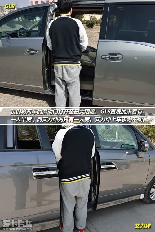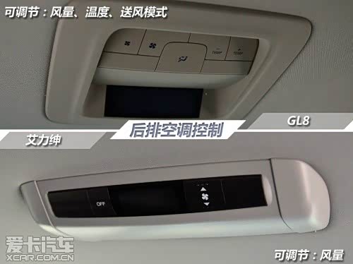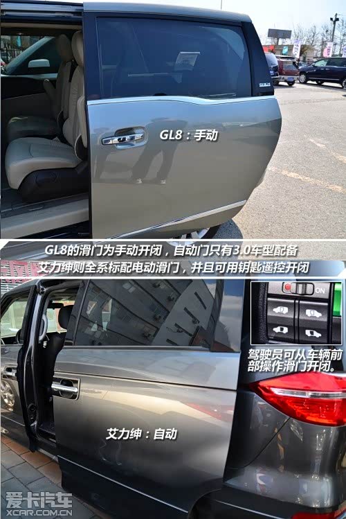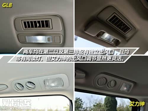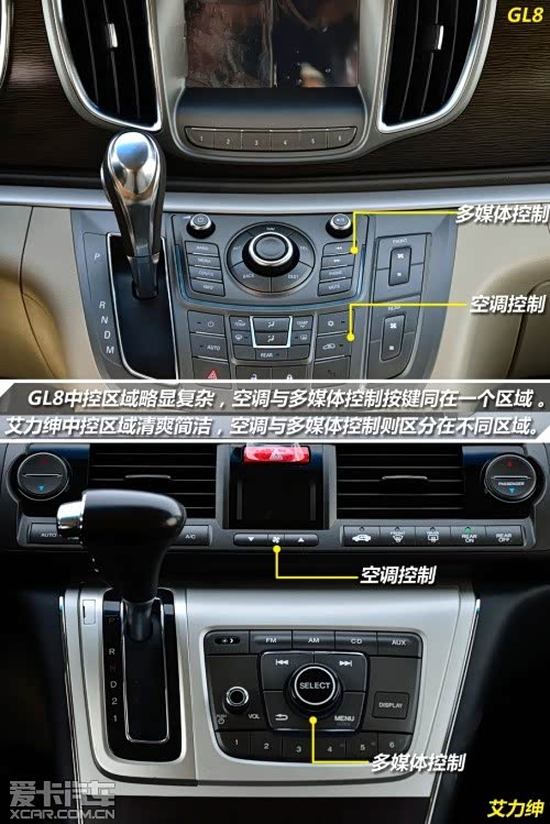 在两车的舒适性配置方面,它们自然各有千秋。首先在中控大屏方面, GL8带有导航模式,而且尺寸也相对较大。艾力绅的中控屏幕相对比起来则要寒酸的多,只有5寸的大小的屏幕并没有导航功能,但是可显示倒车影像。两车均采用自动空调,而温度分区方面则有不同,GL8为前后分区,艾力绅则为左右分区。在后门配置上,GL8只有3.0车型配备电动门,而艾力绅则是全系标配。