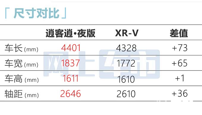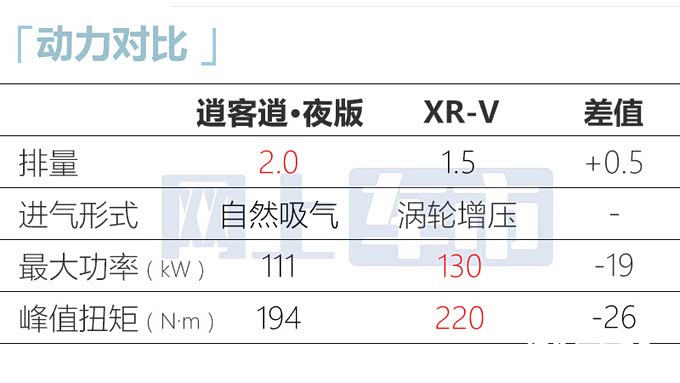 逍客逍·夜版整车尺寸较本田XR-V更占优。动力上搭载2.0L横置发动机,最大功率111kW,峰值扭矩194N·m,较XR-V略逊一筹。