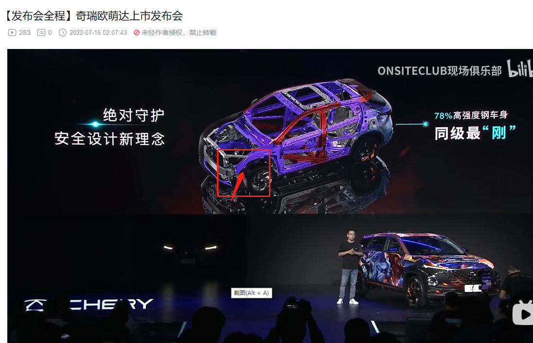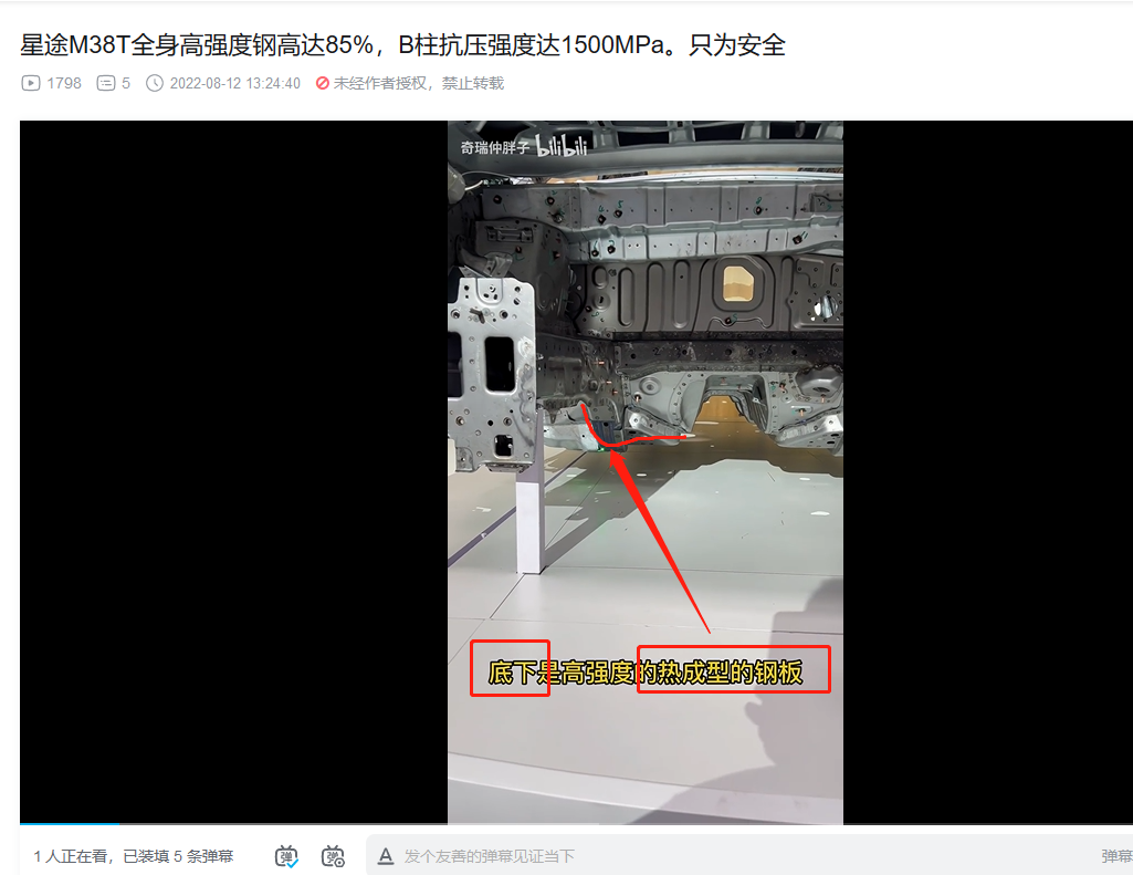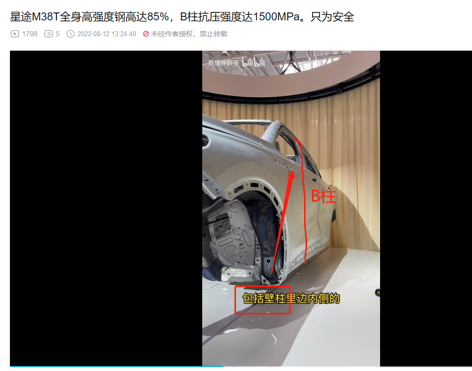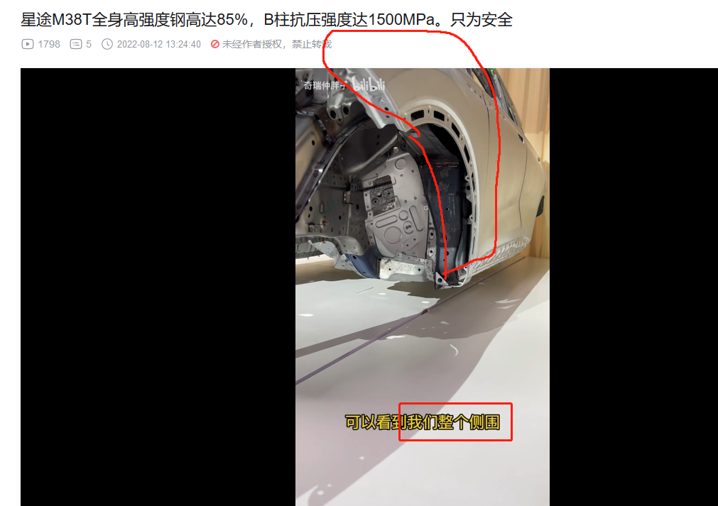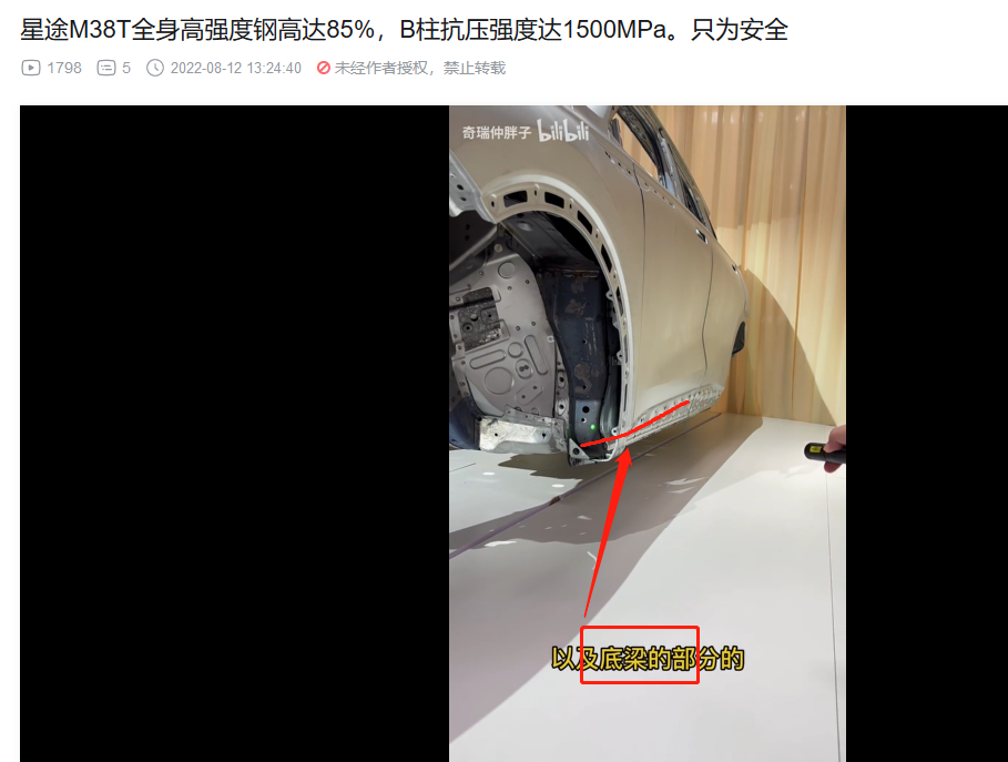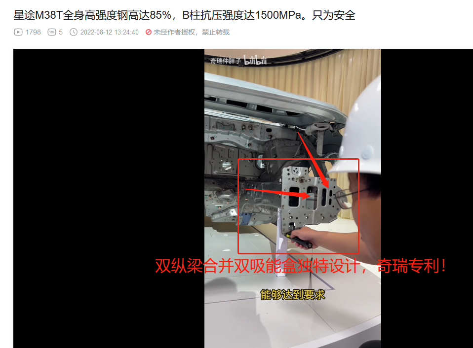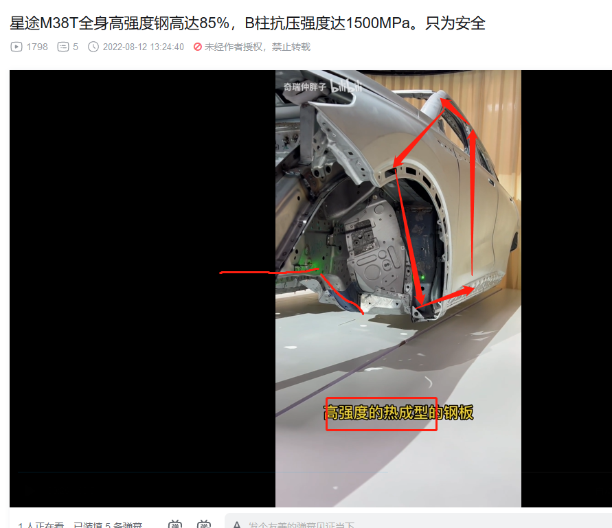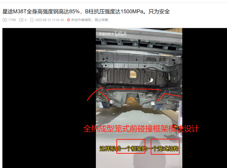 3. 前机舱和驾驶位车体核心部分的横梁,热成型!(视频里面说本特勒,没直接说热成型,不过看颜色,那显然是热成型,而且M38T和艾瑞泽8的官方解剖图也都标注了,视频部分偷懒而已)。