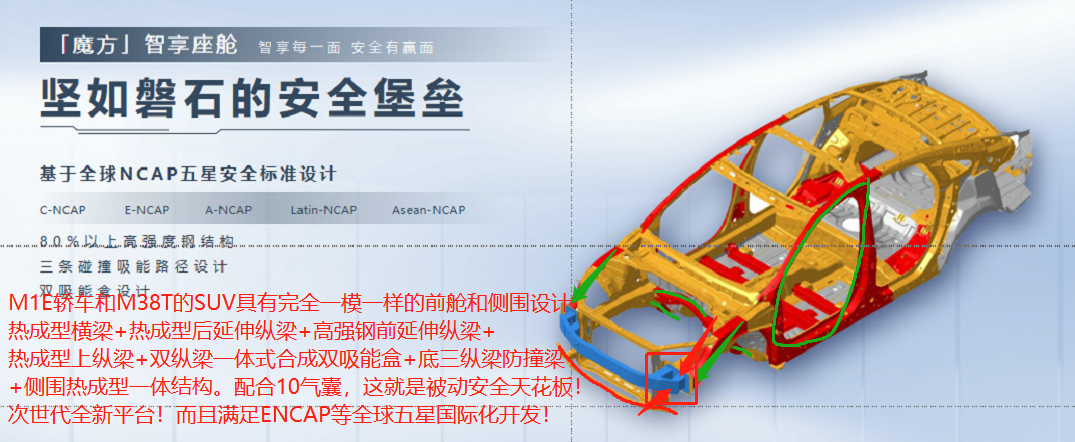 18,重头戏,艾瑞泽8,代号M1E。我贴了这张图之后,其实所有答案都很明了了。这个和M38T完全是一模一样的白车身安全模块构架设计,前机舱热成型钢的横梁+热成型钢后延伸纵梁+热成型钢上纵梁+高强钢前延伸纵梁+双纵梁一体双吸能盒设计!!依然保留了SUV才给的下三路防撞横梁还。同时,侧围和M38T一样,一体式热成型钢的底梁+B柱+侧围!!至于内测大量的横梁热成型,后排核心C柱下热成型那就不用说了。所以,M1E,和M1A,M1D,M16有直接关系了么?基本没有了。这就是全新的SUV+轿车一体打通的模块化平台,和T2X或者M38T平台完全一样的设计!也超越了M3X原由星途和观致平台的安全构架设计!