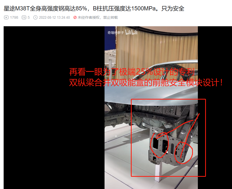 4.然后就是这个奇瑞安全专利,非常独特的牛x设计!双纵梁合并双吸能盒一体模块化结构!!这个是独创的技术,就是为了能够实现极端25%甚至12%的碰撞条件下前机舱的安全!!其他家包括豪车不过都是敷衍下改改,土鳖是真给你设计这么独特的牛x结构!注意,上纵梁在观致5时代就有,M3X平台典型特征,只不过上纵梁当初并没有吸能盒也没有和下纵梁合并,虽然一样能够满足25%标准没问题,但是土鳖不满足,非要创新!那么,这次就做成了上下连接在一起闭环同时双吸能盒设计!几乎是wudi一样的想法,我实在是想象不出来25%保护还能怎么玩这部分结构了!而且,上纵梁黑色的,是热成型还!!!这个就非常BT了!这套模块化设计在次世代平台都有体现,因为没看到欧萌达5的全部清晰解剖,理论商欧萌达5也是一样的!后面的T22,M38T自然不用说,艾瑞泽8的M1E也是这个设计!