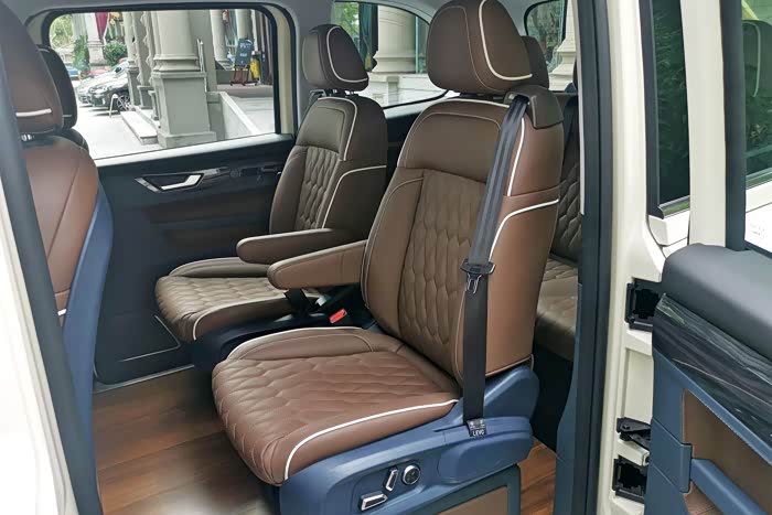 内饰的看点在于座椅布局。据说根据车型不同,新车将提供有“1+3+3”自由出行版、“2+2+3”商务版和“2+3”都市客厅版车型。具体到商务版本,其最大的变化在于其座椅布局发生改变,从“伦敦出租车”经典的“对向3+3座”变成了更加传统的“2+3座”顺向布置,并且中间两把独立座椅也具备了电动调节与扶手,以及独立安全带。第三排座椅则取消了中央扶手,换成三把独立座椅。