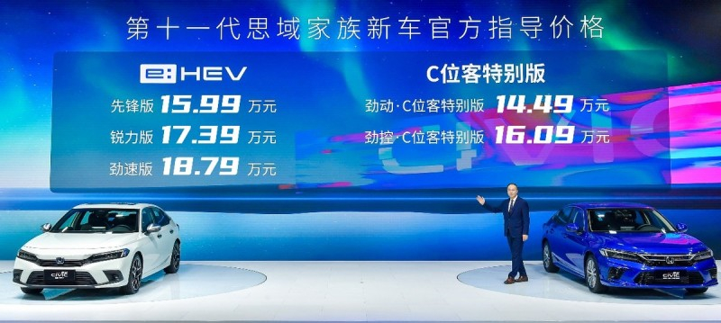 东风本田第十一代思域e:HEV(混动版)推出3款车型,售价区间15.99-18.79万元。为了增加辨识度,外观在燃油版基础上新增了蓝底的本田LOGO、银色外后视镜以及车尾的“e:HEV”标识。内饰的区别在于换装了全新的按键式换挡,仪表盘上增加电动功率的显示。动力采用2.0L发动机加电动机组成的混动系统,百公里综合油耗4.39L,是国内首款搭载第四代i-MMD技术的车型。