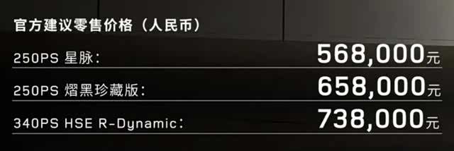 新车继续提供3款配置车型,分别为:250PS、250PS 熠黑珍藏版、340PS HSE R-Dynamic,官方售价56.8-73.8万元。其中2022款“熠金珍藏版”调整为2023款“熠黑珍藏版”。