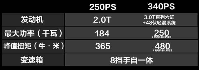 340PS(3.0T L6发动机):最大功率250KW(340Ps),最大扭矩480N.m,零百加速6.3秒。
