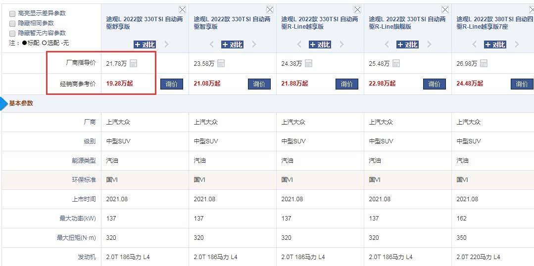 经过以上几个方面的综合对比,个人认为途观L的错位竞争政策是相当成功的,而更让人期待的是,2023款途观L已经正式上市。除了全新样式双色切削轮毂和外观的一些细节改动,2023款途观L最重要的变化之一,是新增1.4T发动机的280 TSI车型和PHEV插混车型,进一步丰富了动力系统的选择,也令2023款途观L的门槛大幅下探,相比2022款21.78万的起售价,2023款19.9万的价格直接将入门门槛拉低了不少。