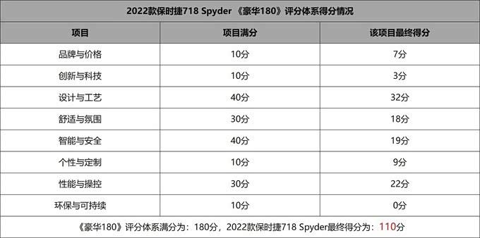 总结:最终2022款 保时捷718(参数|询价) Spyder在豪车事“豪华180”豪华评分体系的总得分为:110分,属于足够豪华的标准。