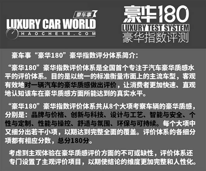 “豪华180”豪华指数评分体系满分为180分,根据最终得分分为:不够豪华(90分以下)、入门豪华(90-109分)、足够豪华(110-129分)、非常豪华(130-159分)、顶级豪华(160-180分)。