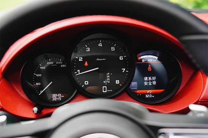 保时捷718 Spyder的仪表盘采用了经典的三联表设计,左侧的时速表和中间的转速表都沿用了机械指针设计,而右侧则采用的是4.6英寸液晶显示屏。不过遗憾的是,这款车并未配备HUD抬头显示系统,以及时下流行的AR实景导航和3D显示功能。