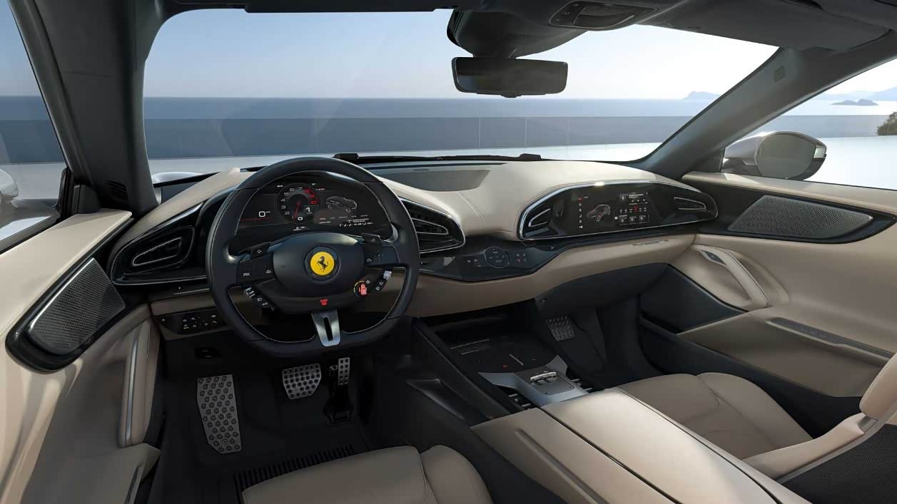 进入车内我们可以发现,新车并未采用运动感极强的碳纤维设计,而是以真皮包裹,这在以往的法拉利车型当中非常少见,而且中控台设计几乎完全对称,取消中控屏幕设计,而是给驾驶员和副驾驶各一块屏幕,中间的区域就留给空调面板,地台也保留了触控按键和实体按键,实用性比较足。
