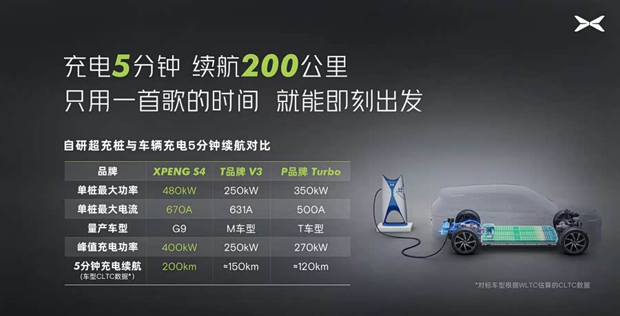 小鹏前不久推出的S4超快充,单桩最大功率达到480kW,峰值充电功率达到400kW,宣传充电5分钟续航可达200km(CLTC工况,目前支持G9车型)。