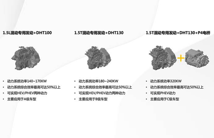 1指的就是一套DHT高级程度油电混动系统,2指的是2种动力架构,3指的是对应的3套动力总成,包含1.5升自然吸气以及涡轮增压发动机对应FHT100和130变速箱。这样来看是不是就简单了许多。
