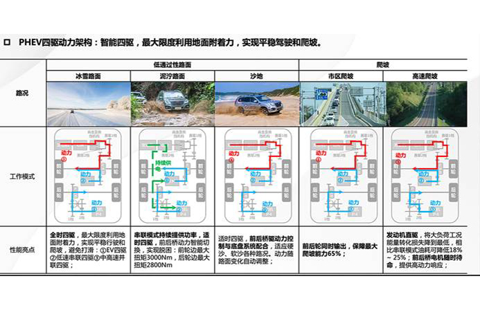 车辆在中高车速时将会采用直驱模式,这也是燃油机最为省油的速度区间,发动机通过DHT大速比齿轮组直接驱动车辆,而在急加速以及需要超车的时候,发动机和电机将会采用并联模式下驱动,已得到更好的加速度。