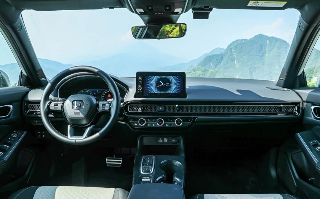 内饰的布局同样延续了燃油版,全液晶仪表搭配悬浮式的中控屏,带来了不错的科技感,贯穿式的空调出风口进一步拉伸了内饰的视觉效果,下方的物理旋钮按键在操作方面也是十分便捷。新车最大的亮点是将传统的机械式换挡机构,改为按键式换挡机构,这也是本田系混动车型的一贯做法。
