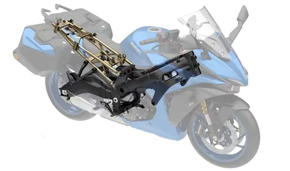 3.车身方面,铃木GSX-S1000GT将采用铝合金双翼梁主车架和钢管副车架的组合形式,两者属于紧固连接,将会有比较好的柔性,对于舒适性会有很大的帮助。