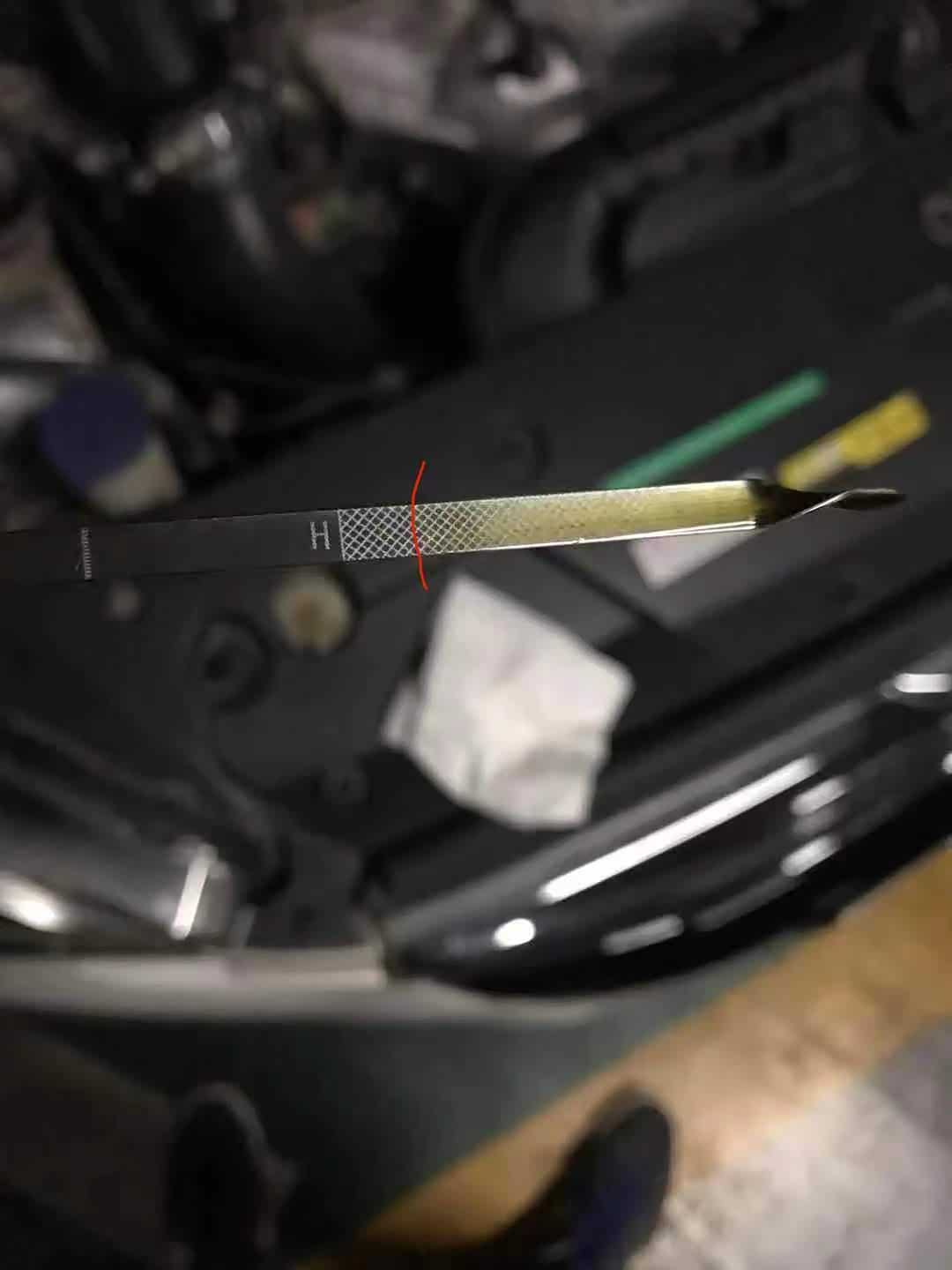 这两组又耗费大概1个月左右,终于两箱油用完了,然后放置一晚第二天冷车查看机油,惊喜来啦