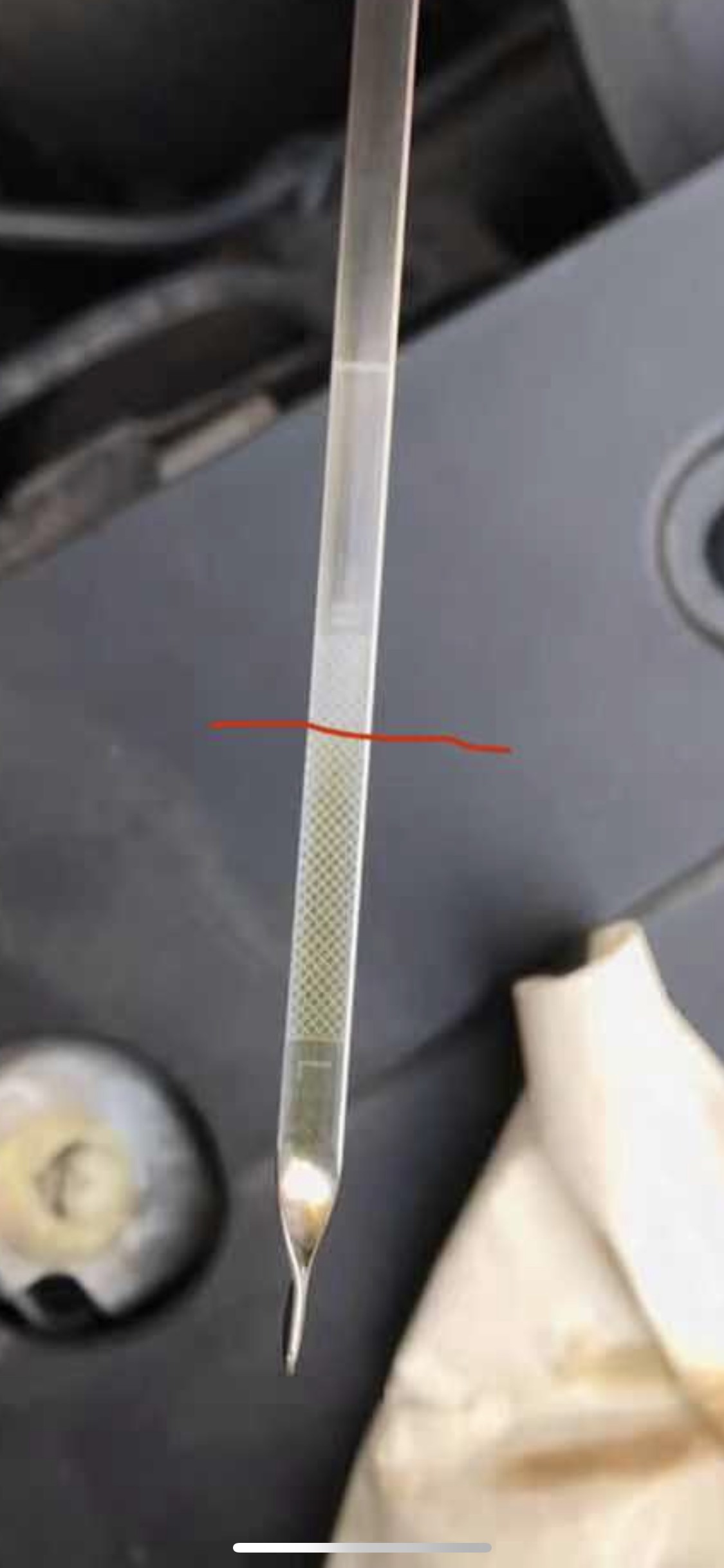 未补机油前的机油尺机刻度线位置