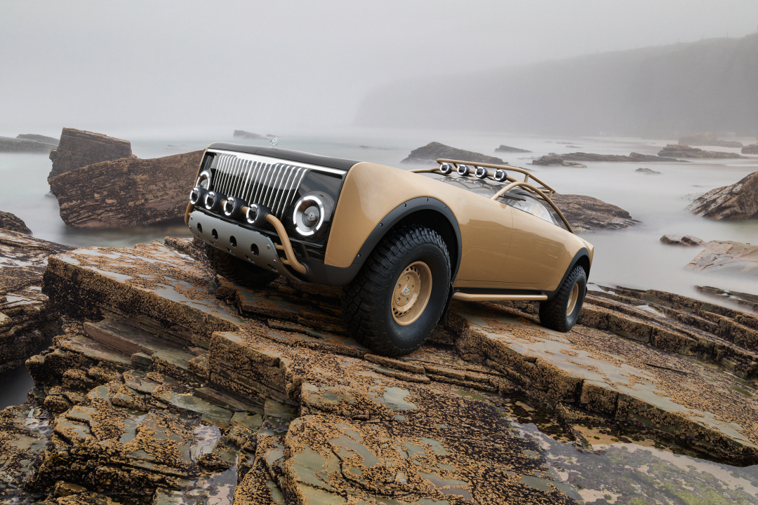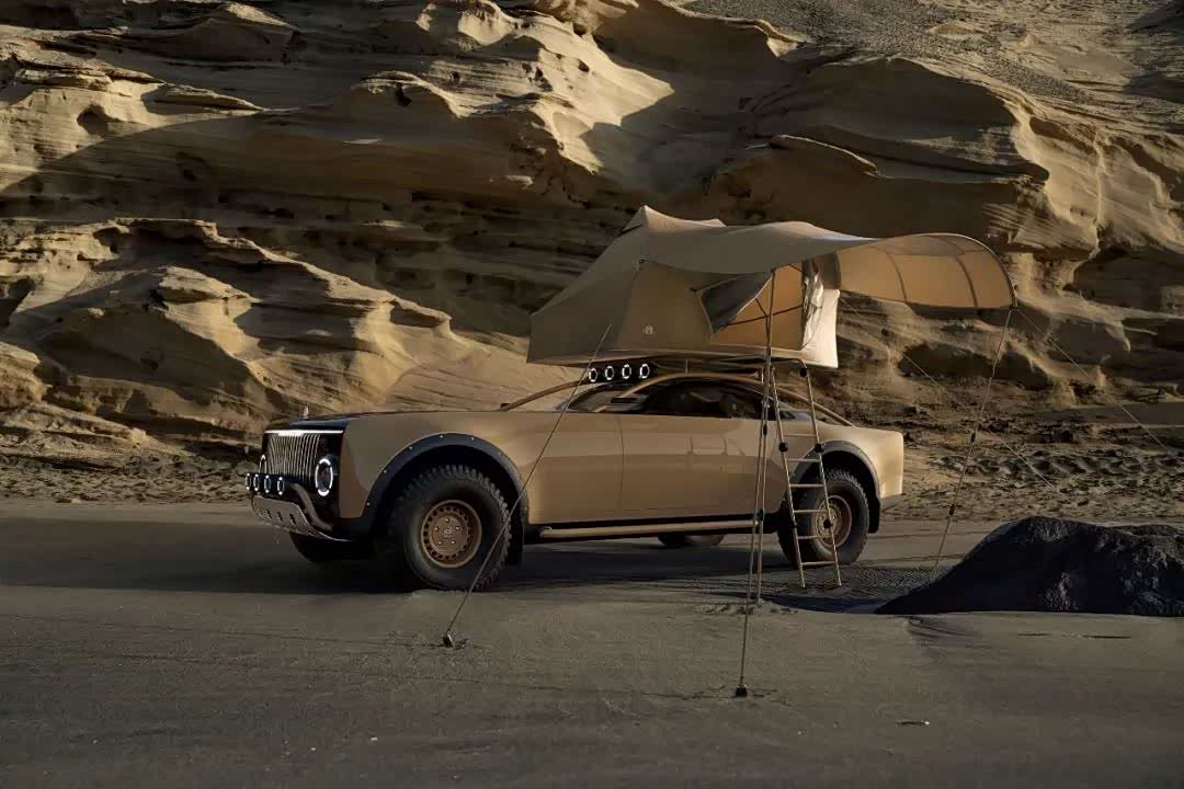 结果呢,如大家所见,Project MAYBACH的设计就非常具有户外探险风。这款双座电动越野概念车不仅高耸,而且拥有近6米长的车长,看着就是能干的料。涂装是双色,其中包括非常大胆的沙色车漆,尽显狂野,让人不自觉就能联想到苍茫的沙漠。