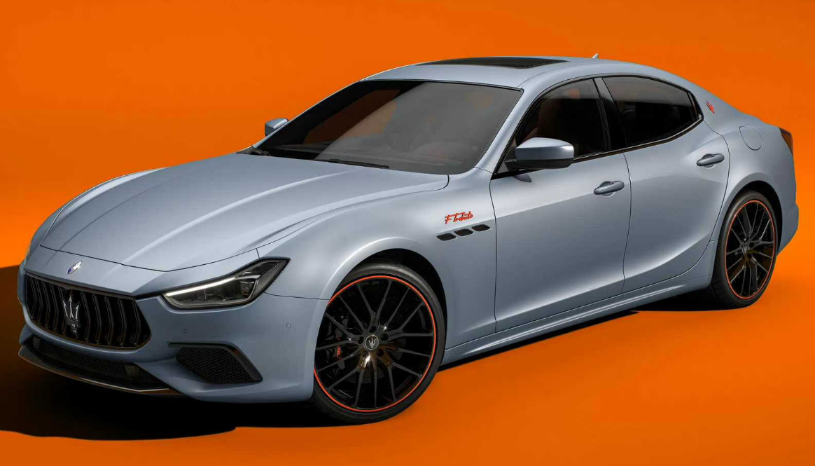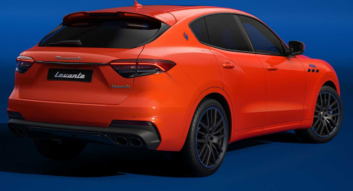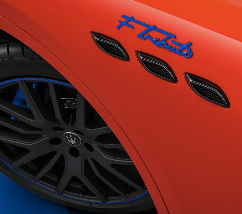 玛莎拉蒂将提供 Arancio Devil 橙色或 Grigio Lamiera 灰色的限量系列 FTributo Ghibli 和 Levante。将橙色与钴蓝色搭配,在轮毂细节、FTributo 前翼子板徽章和 C 柱三叉戟上采用了钴蓝色。