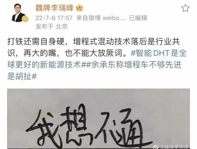 是可忍孰不可忍,于是7月份一向低调的李瑞峰亲自下场,连续多次发微博“手撕”余承东,甚至发起投票让网友表态增程式和DHT-PHEV哪个先进,把魏牌管理团队焦躁而束手无策的状态暴露无遗。
