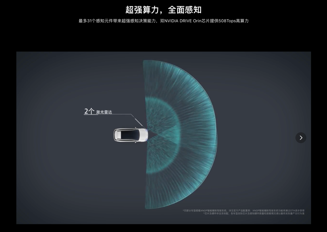 G9的MAX版车型采用双NVIDIA DRIVE Orin超级计算平台,总算力达到508 TOPS。感知系统由31个感知元件组成。其中,800万像素前向双目摄像头可以很好地实现目标物区分与距离冗余识别;双激光雷达带来180°水平视角覆盖范围,车前布局方案有效减小垂直视角盲区,能够更好应对各种城市复杂工况。
