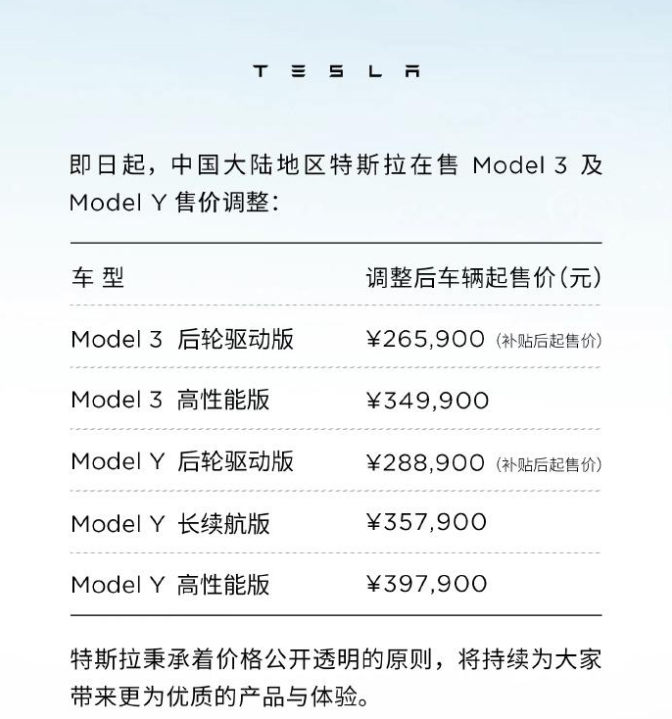 10月24日清晨醒来的第一则新闻,特斯拉又降价了。特斯拉官方宣布,中国大陆地区特斯拉在售 Model 3 及 Model Y 售价调整,调整后 Model 3 后驱版下调1.4万元,降至26.59万元,高性能版下调1.8万元,降至34.99万元。Model Y 后驱版下调2.8万元,降至28.89万元,长续航版本更是一口气下调3.7万元,降至35.79万元,高性能版下调2万元,降至39.79万元。