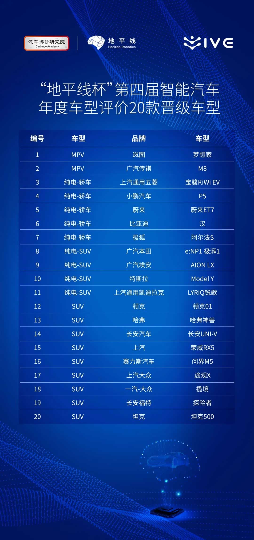 汽车评价:作为长期关注中国汽车产业发展、深度洞察产业趋势的专业型评价机构,汽车评价研究院已连续三年聚焦于智能汽车领域,举办了中国智能汽车年度车型评价活动,堪称“中国首创,世界唯一”,经过三年的沉淀积累,本届评价重磅升级,正式更名为“地平线杯”第四届世界智能汽车年度车型评价。