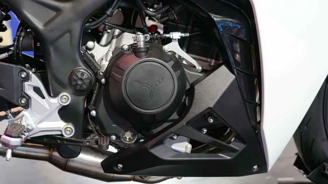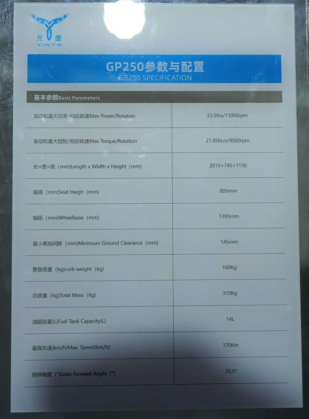 根据现场公开的参数表显示,元图GP250的整备重量只有160kg,要知道这可是一款双缸车型,相比竞争对手超过170kg的重量,GP250的轻量化做的还是相当出色的,其中有很大一部分原因,是大量采用了铝合金材质。