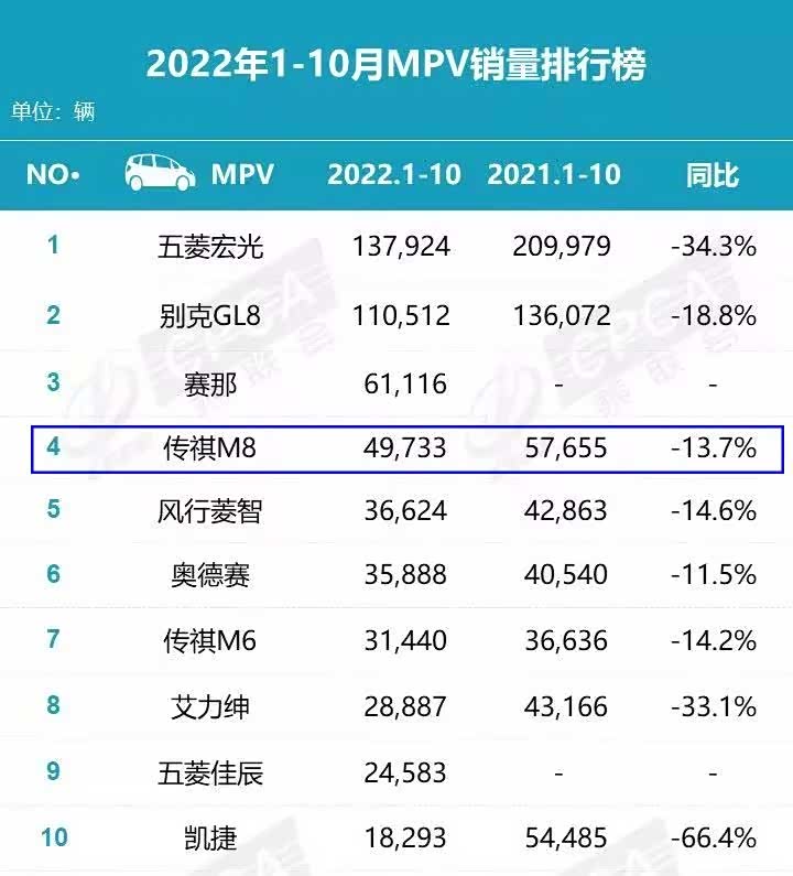 乘联会数据显示,今年1-10月,广汽传祺M8以累计销量49733辆,在国内MPV销量排行榜位列第四,紧随别克GL8和丰田赛那之后。而价位区间有所重叠的合资MPV奥德赛、艾力绅、威然则是排在了6、8、14名。作为参考,广汽丰田赛那前十月的累计销量为61116辆,与传祺M8并未拉开较大的差距。