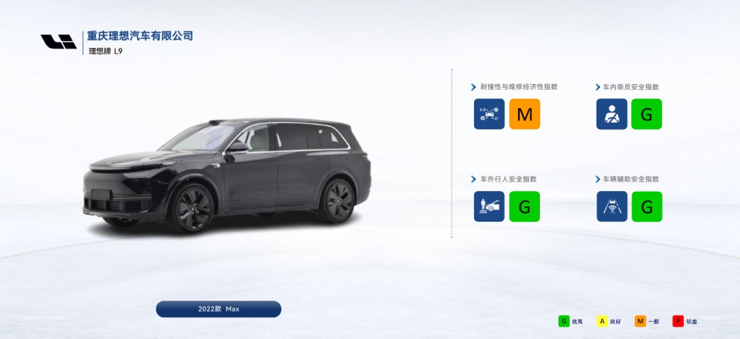 剩下的两款新能源车,理想L9、小鹏P5均在车内乘员安全指数、车外行人安全指数、车辆辅助安全指数均拿到了G级评分。特别是理想L9,在三项指数的所有细分项目中都拿到了G级评分。