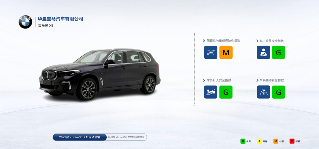 宝马在车内乘员安全指数、车外行人安全指数、车辆辅助安全指数均拿到了G级评分。在三项指数的所有细分项目中也都拿到了G级评分。作为一台60.5万起售的豪华品牌车型,这个成绩理所应当。