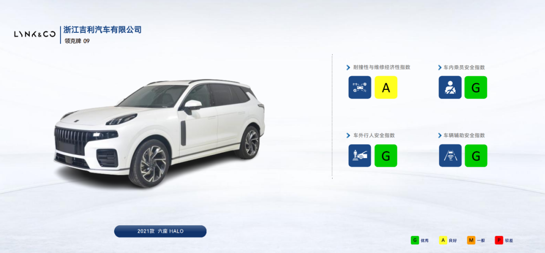 吉利领克09是除欧拉好猫外,剩下的13款车中唯一拿到耐撞性与维修经济性指数A级评分的车型。在剩下的三个项目中,09则和理想L9一样,在三项指数的所有细分项目中都拿到了G级评分。