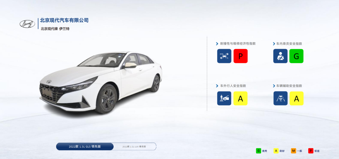 伊兰特不仅不保护车内的驾驶员和乘员,也不保护车外的行人,行人保护总体评分仅为A级,也是14款车型中唯一一款在行人保护上没拿到G级的车型。