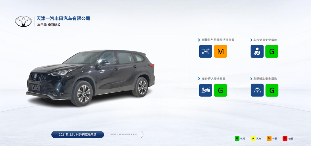 丰田皇冠陆放的成绩很不错,没有需要单独拎出来讲的部分,驾驶员侧正面25%偏置碰撞、侧面碰撞中的所有细分项目评分均为G级。