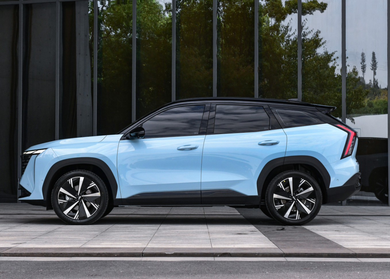 侧面的话,它更像是在强调一种运动感,腰线到了B柱之后就开始上扬,到了尾部的时候已经收得很窄,悬浮式车顶的设计辅以溜背的线条,有点轿跑的味道。车尾的灯光设计与车头相呼应,也是采用了贯穿式设计,并且到了两侧还同时向上和向下发散,整个灯光的面积很大,我觉得这是有些用力过猛了,过于夸张,并且拉高了整个视觉重心,效果并没有车头来得好。