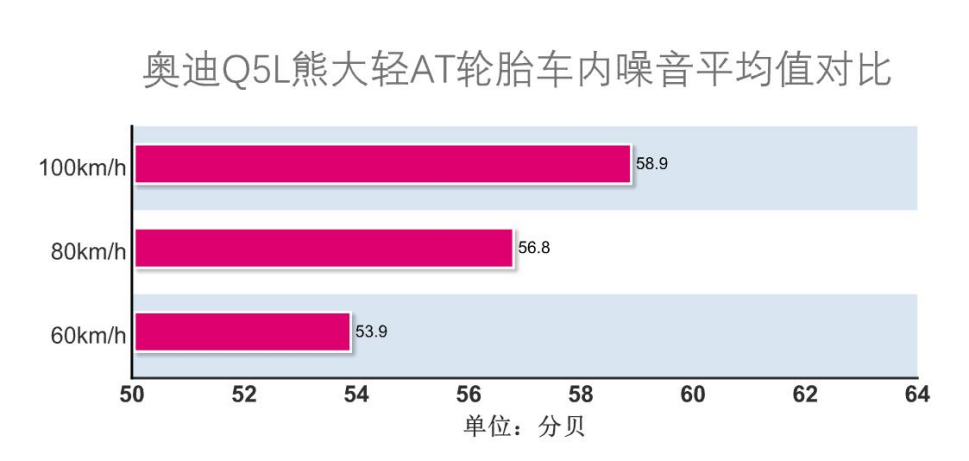 实测速度60km/h时,噪音为53.9分贝;80km/h时,噪音为56.8分贝;100km/h时,噪音为58.9分贝。