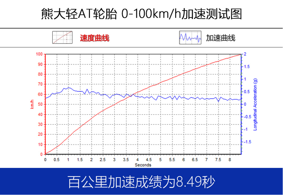 最终实测黑熊轻AT百公里加速成绩最快是8.49秒,纵向牵引力表现出色。