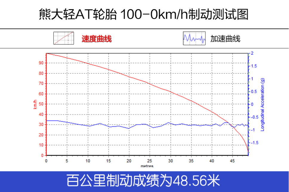 制动过程中,明显感觉到制动距离稍微拉长,制动感觉也发生轻微的变化。黑熊轻AT的花纹块更大,沟槽更宽,让制动距离稍微增长,但属于可接受范围之内。最终实测,黑熊轻AT轮胎的百公里制动成绩为48.56米。