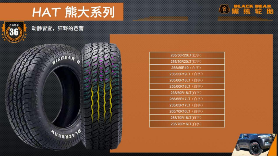 黑熊轻AT的型号比较丰富,从最入门的宽度235到265,尺寸16-20寸都有,可以满足大多数SUV的尺寸规格。