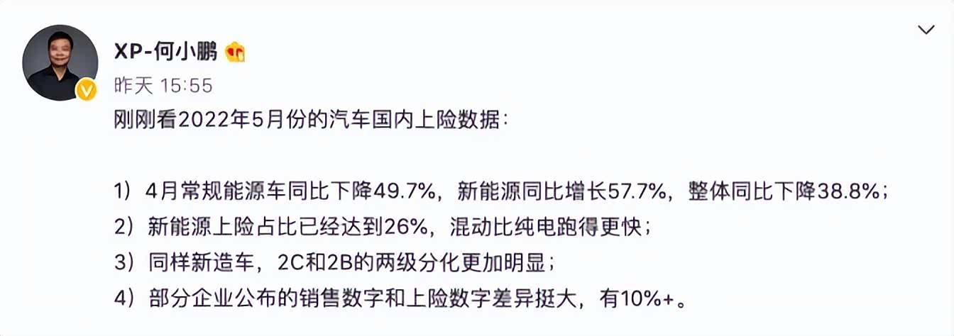 今年5月,小鹏汽车创始人何小鹏在其社交平台发表了自己的观点:部分企业公布的销售数字和上险数字差异挺大,有10%+。虽未指名道姓,但懂的人自然也懂了。